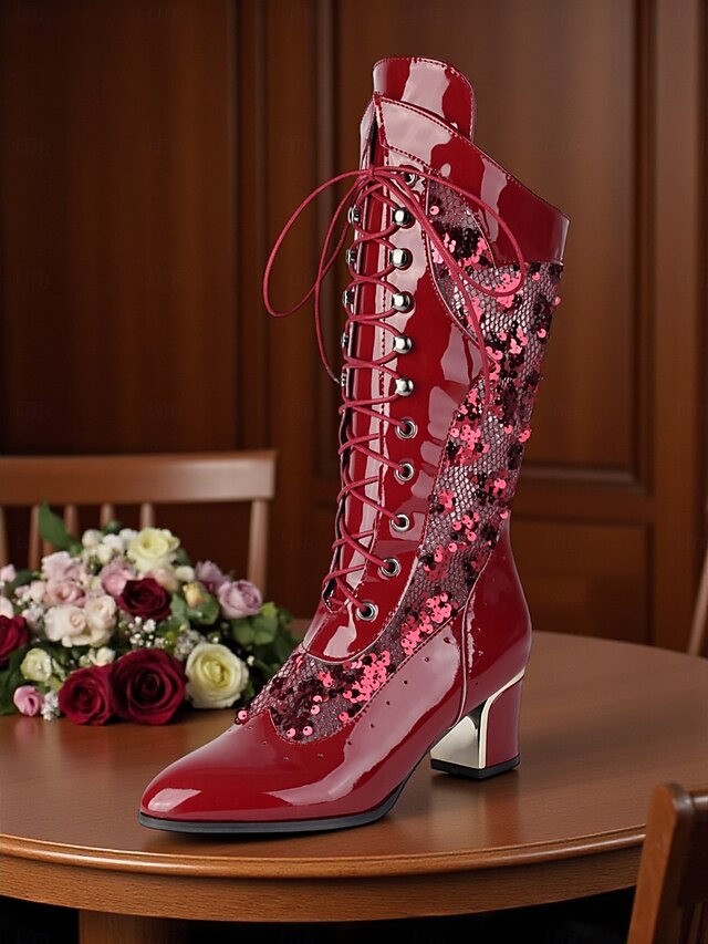 HOT ! Women's Green Faux Patent Leather Sequin Lace-Up Mid-Calf Boots - Chunky Heel 1930s-Inspired Vintage Boots for Stage Performance,Gothic Parties and Holiday Events