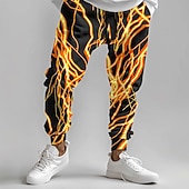 Highlights [Fabric] : Expertly crafted from high-quality polyester, these men's lightning sweatpants provide a perfect combination of comfort and durability. The material ensures breathability and flexibility, ideal for everyday activities throughout the Spring, Fall, and Winter seasons. [Fit] : Featuring a regular fit, these jogger-style pants offer a modern and relaxed silhouette. The mid-waist design with a drawstring elastic waistband provides a secure and adjustable fit, while the ribbed cuffs gently hug the ankles to complete the look. [Design Highlights] : The standout design includes a striking black base with vibrant 3D printed lightning patterns in eye-catching orange and yellow. Equipped with functional pockets, these joggers add a practical touch to their bold visual appeal. [Occasions] : Perfect for daily wear or street style, these fashion-forward sweatpants are suitable for days spent lounging at home or making a statement on your urban adventures. [Size Range] : Available in a wide range of sizes from S to XXXL, ensuring that you find the perfect fit for optimal comfort and style.