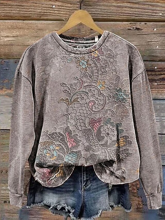 Women's Pullover Sweatshirt Floral Warm Vintage Western Long Sleeve Crew Neck Regular Tops Home Street Dailywear Print White Dark Pink Blue Green Gray Summer Spring Fall Winter 7