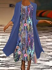 More information about Women's Dress Set Summer Dress Casual Semi Formal Floral Graphic Print Midi Dress 3/4 Length Sleeve Crew Neck Daily Holiday Blue Purple Summer Spring Loose Fit