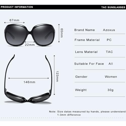 • PROMISE GUARANTEE -- Customers' orders are valid with lifetime. No hesitation to contact us when you have any questions about products. PACKAGE INCLUDES -Azoxus elegant trendy polarized sunglasses for women x1/box x1/exquisite pouch x1/lens cloth x1/polarized testing card x1.