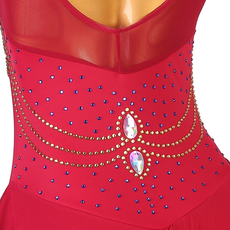 Figure Skating Dress Women's Girls' Ice Skating Dress Burgundy Patchwork Open Back Mesh High Elasticity Training Competition Skating Wear Classic Crystal / Rhinestone Long Sleeve Ice Skating Figure 4