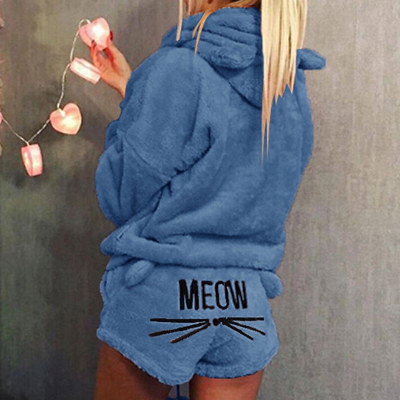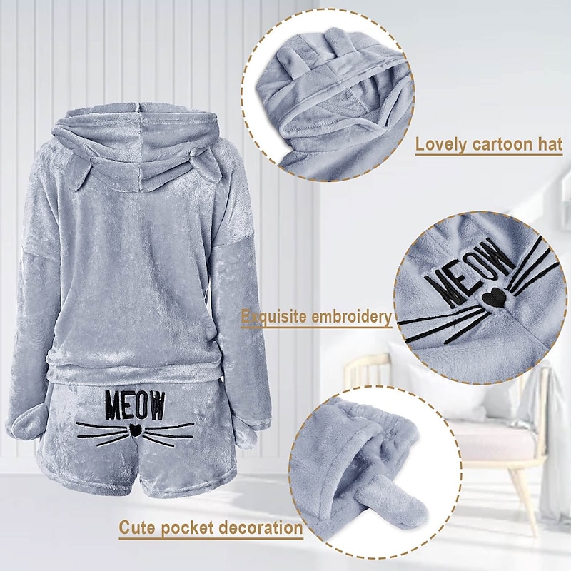 Highlights [Fabric]: Crafted from plush fleece, this loungewear set ensures warmth and comfort, perfect for the chilly months of fall and winter. Its micro-elasticity provides flexibility and ease of movement. [Fit]: The set includes a hooded top and shorts, designed for a relaxed and cozy fit. The hoodie offers full coverage with long sleeves, while the shorts provide a snug feel with an elastic waistband for extra comfort. [Design Highlights]: The hooded top features playful ear details for a whimsical touch, while the shorts are adorned with a fun "MEOW" print and cat whiskers graphic on the back, adding charm and personality to your loungewear. [Occasions]: Ideal for lounging at home, cozy nights in, or casual street wear, this set is versatile enough to transition from bed to daily outings seamlessly. Suitable for a relaxed day around the house or stepping out for a quick errand. [Size Range]: Available in sizes S, M, L, XL, and 2XL, this set is designed to cater to a wide range of body types, ensuring a comfortable and flattering fit for all.