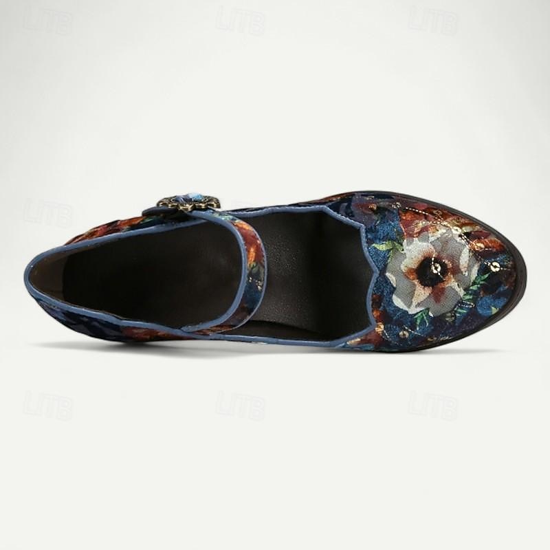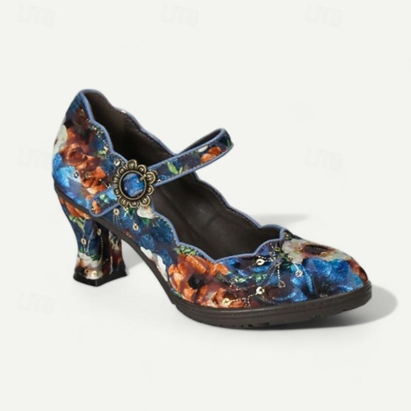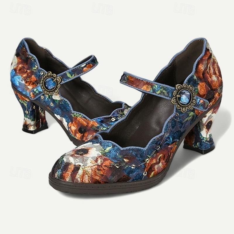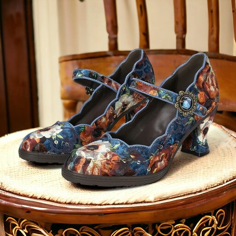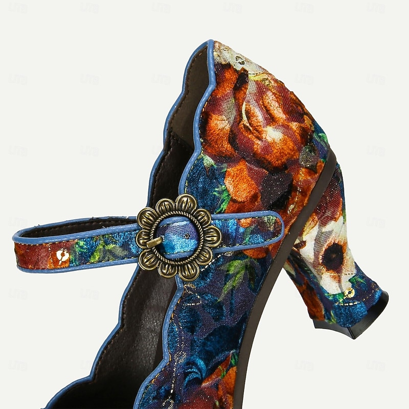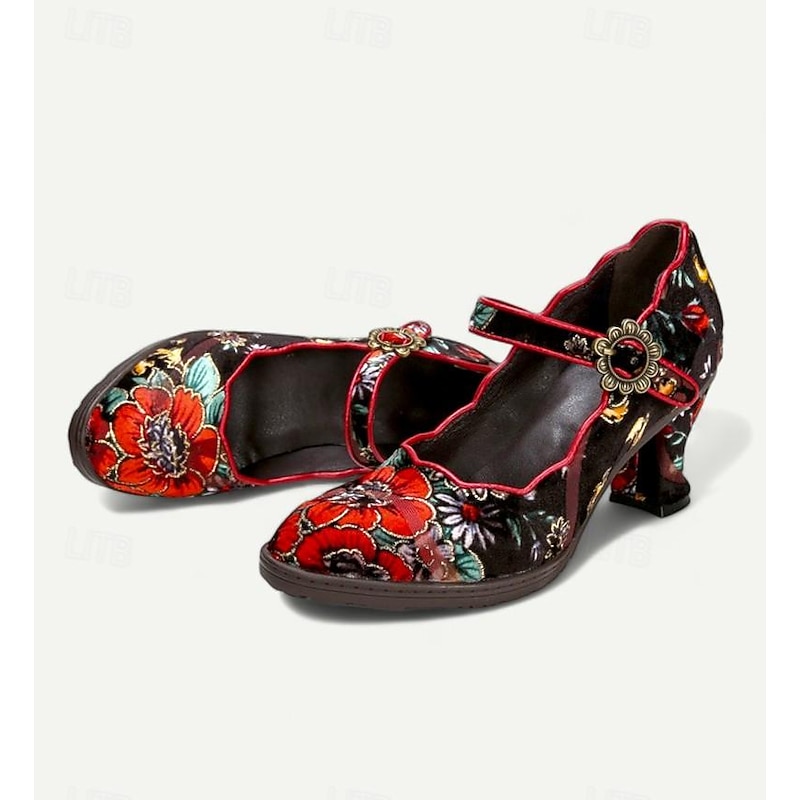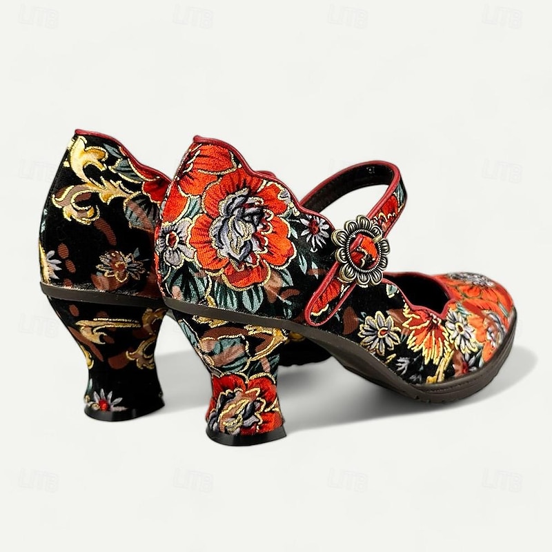 Highlights [Fabric] : Crafted with a luxurious blend of leather and satin, these Women's Heels Pumps offer an elegant texture that complements their vintage-inspired look. The shoes are lined with synthetic leather, ensuring a comfortable and durable wear suitable for various occasions throughout the year. [Silhouette] : The classic Mary Jane style with a round toe and mid-height cone heel offers a flattering silhouette. This timeless design combines comfort with sophistication, making it a versatile choice for any wardrobe. [Design Highlights] : These heels feature intricate floral embroidery, adding an artisanal touch to their aesthetic. The decorative ankle strap buckle enhances both functionality and style, while the red trim provides a striking contrast to the rich base fabric. The mix of cone and fantasy heel designs provides an eye-catching element that elevates these shoes' overall look. [Occasions] : Perfect for parties, Valentine's Day celebrations, and other special events, these pumps effortlessly transition from formal to casual settings. Whether you're attending a festive gathering or enjoying a romantic evening, these shoes add a touch of elegance and charm to any ensemble. [Size Range] : Available in a variety of sizes, from US6 to US12, these heels ensure a suitable fit for a diverse range of foot sizes, accommodating both comfort and style preferences.