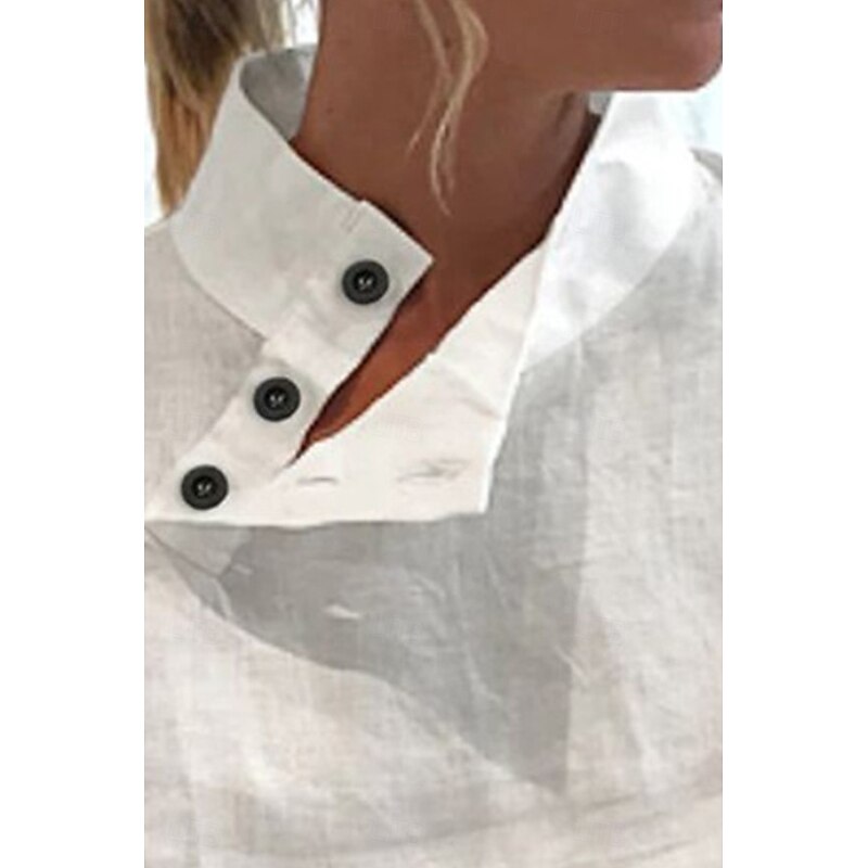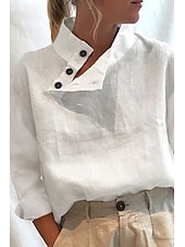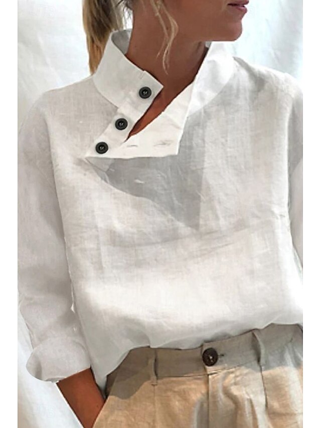 More information about Women's Shirt Cotton Linen Shirts Blouse Plain Basic Modern Casual Long Sleeve High Neck Regular Tops Daily Going out Buttons White Summer