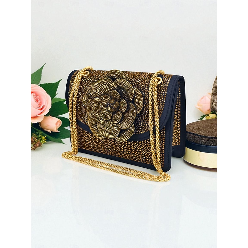 HOT ! Women's Gold Rhinestone Slingback Pumps with Matching Handbag Set - Elegant Floral Design Dress Shoes and Bag for Formal Events and Cocktail Parties