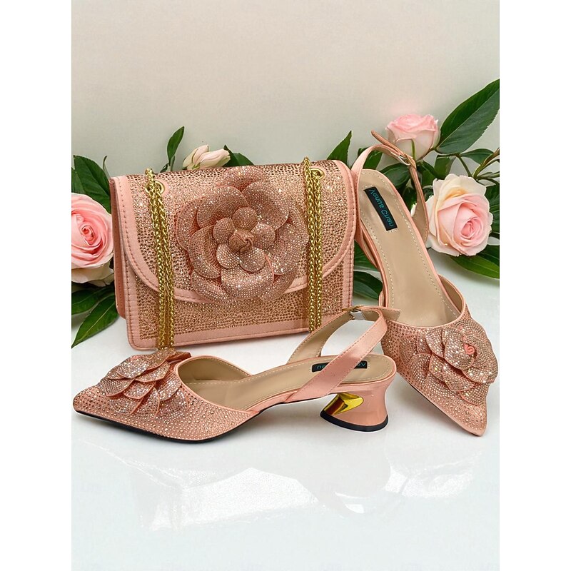 Women's Gold Rhinestone Slingback Pumps with Matching Handbag Set - Elegant Floral Design Dress Shoes and Bag for Formal Events and Cocktail Parties 2