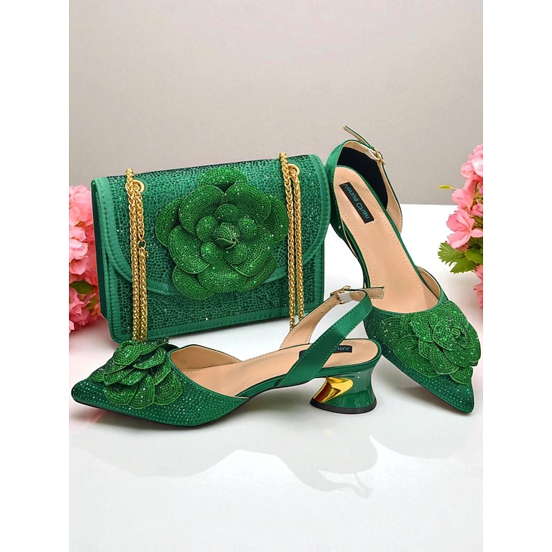 Women's Gold Rhinestone Slingback Pumps with Matching Handbag Set - Elegant Floral Design Dress Shoes and Bag for Formal Events and Cocktail Parties 12