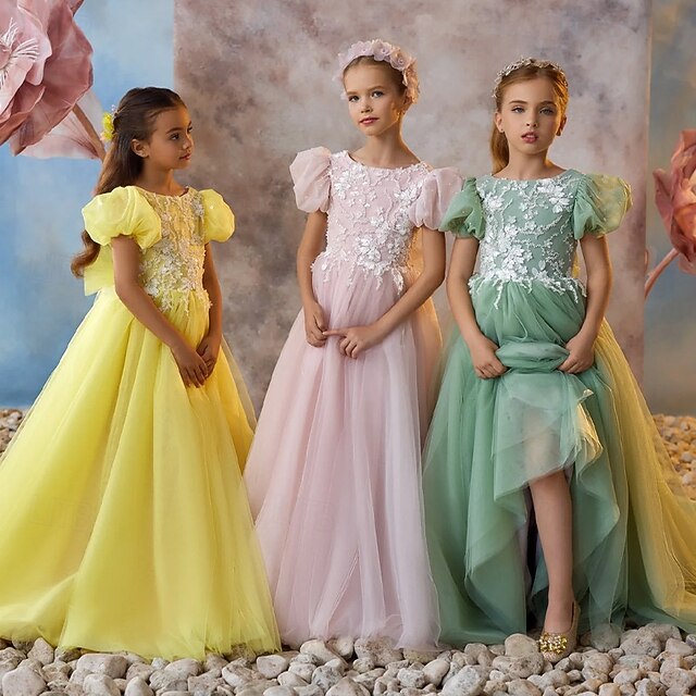 More information about Kids Girls' Flower Girl Dress Party Dress Solid Color Sleeveless Long Sleeve Performance Wedding Party Mesh Princess Sweet Mesh Mid-Calf Sheath Dress Tulle Dress Summer Spring Fall kids Yellow Pink