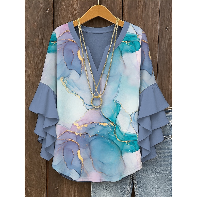 More information about Women's Blouse V Neck Layered Ruffle Sleeve Tops Ombre Graphic Abstract Bohemia Vintage Daily 3/4 Length Sleeve Regular Tops Daily Holiday Vacation Wear Print Pink Blue Green Summer Spring Fall
