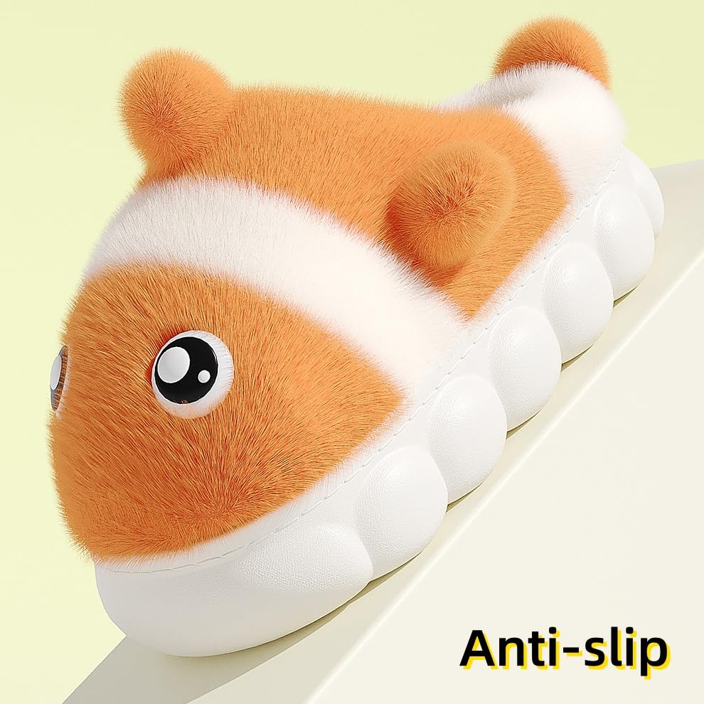 • - **COMFORTABLE MATERIAL**: The slippers are made of soft plush material, which is very comfortable to wear. They have a fully wrapped toe design, which can keep your feet warm in the winter.