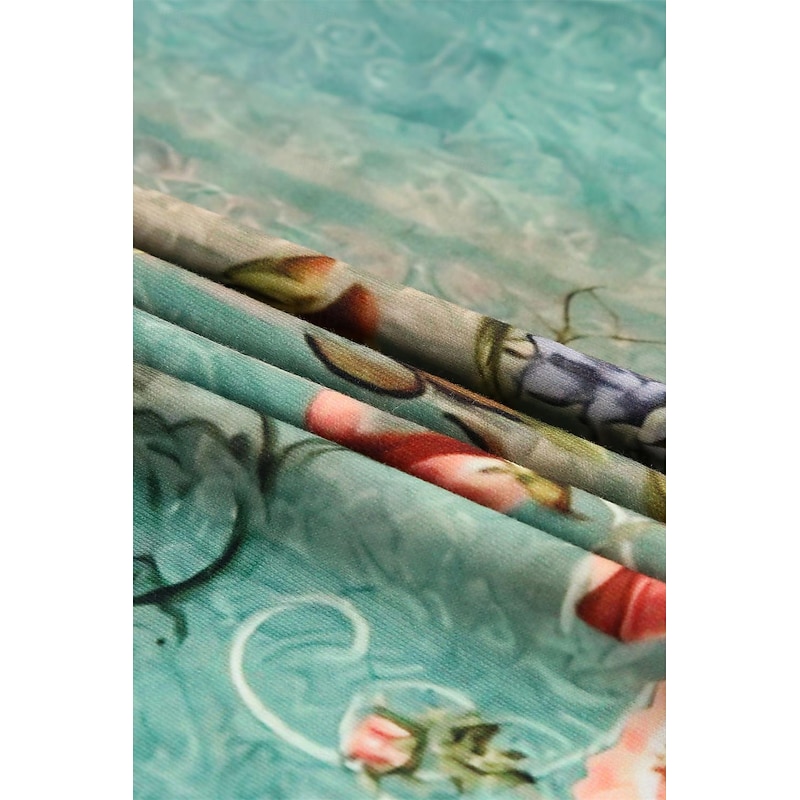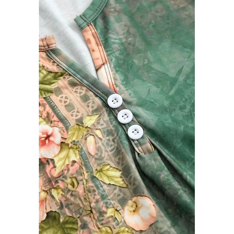: This vibrant dress showcases an elegant floral print in three beautiful colors—green, orange, and dark gray. The V-neckline is beautifully complemented by button detailing, adding a modern and stylish touch. The dress's straight mini hemline, adorned with an intricate border pattern, offers a subtle yet eye-catching contrast.