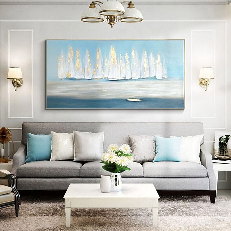 sailboat painting Boat oil paintings hand painted Natural home decor landscape  Oil Painting on Canvas Abstract Art Water sailboat painting sky blue Nature gold art paintings for Living Room Painting 1