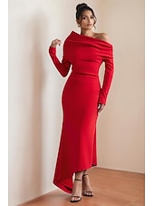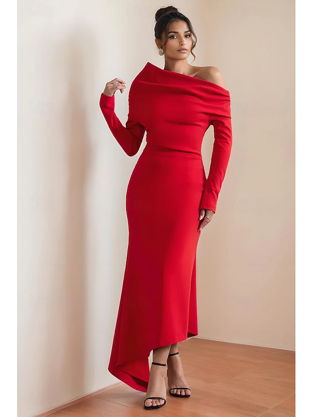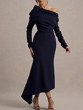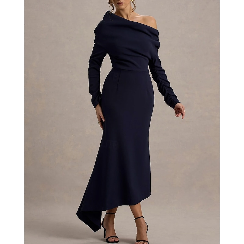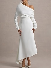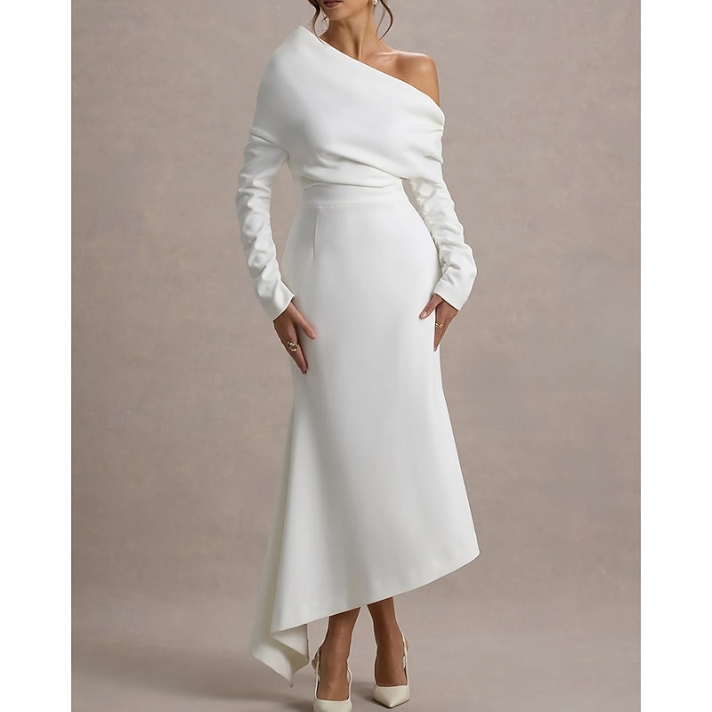 More information about Cape Dress Mermaid / Trumpet Cocktail Dresses Elegant Dress Formal Wedding Asymmetrical Hem Gathered Long Sleeve Off Shoulder Stretch Crepe with Ruched Details