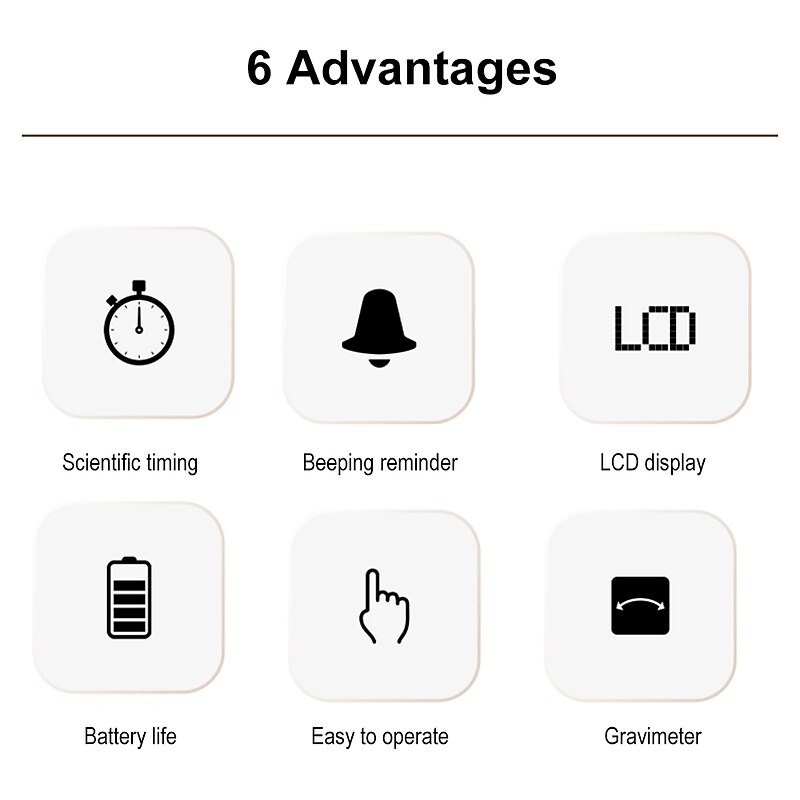 Highlights Product Selling Points: 1. Smart Timer: Accurately time your study and life activities. 2. Scientific Timing: Buzzer reminder, LCD display, and battery life for easy operation. Gravity timing for added convenience. 3. Inductive Timing: Flip open/reset to zero, simple bead-trigger mechanism for easy and efficient timing. Suitable for all ages. 4. Convenient and Versatile: Small size, perfect for home, study, cooking, yoga, office, fitness, and more. 5. Adjustable Volume: Two-speed volume adjustment allows for loud or soft sound. Mode selection dial button with treble and bass options. 6. LED Display: Liquid crystal display provides accurate timing and allows you to easily manage your time. 7. Multi-Scene Application: Ideal for various activities such as applying masks, brushing, cooking, working, studying, and taking naps. 8. Long Battery Life: Requires two No. 7 batteries (not included), which have low power consumption and last for a long time.