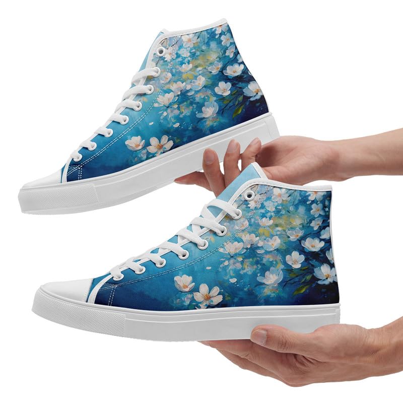 • Elegant Floral Design with Artistic Touch:Showcasing a vibrant floral print inspired by scenic landscapes, these high-tops elevate your wardrobe with a unique artistic flair. The nature-inspired design blends seamlessly with casual, trendy outfits for any occasion