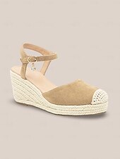 Highlights [Fabric] : Crafted from high-quality microbial leather for durability and comfort, these wedge sandals offer a soft suede feel in a warm beige tone. The upper material is complemented by elegant rhinestone embellishments, adding a touch of sparkle to the design. [Fit] : Featuring a comfortable wedge heel that ranges from 3 to 4 inches, these sandals are designed to provide both height and ease of wear. The rubber outsole ensures stability and support for day-long comfort. [Design Highlights] : These espadrille wedges are stylishly crafted with a rounded closed toe accented by a charming crochet detail, demonstrating both elegance and craftsmanship. The ankle strap includes a delicate buckle fastening and a small dangling charm, adding an extra hint of sophistication. The wedge heel is adorned with traditional braided jute, enhancing the summery aesthetic. [Occasions] : Perfect for a variety of settings, these sandals are ideal for vacation wear, casual daily outings, beach trips, and travel adventures. Their bohemian style makes them a fashionable choice for any warm-weather event. [Size Range] : Available in a wide range of sizes, from US 5.5 to US 10.5, these sandals accommodate various foot sizes, ensuring a perfect fit for all women.