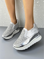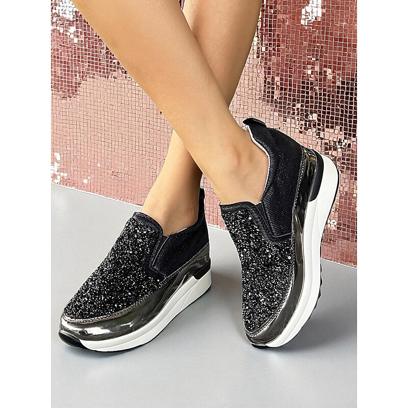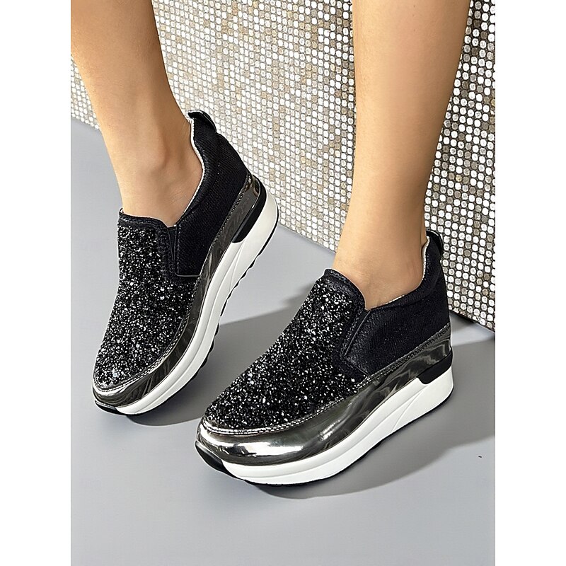 HOT ! Women's Black Glitter Slip-On Sneakers with Metallic Detailing - Stylish Platform Sneakers, Perfect for Nightlife Parties and Casual Outings