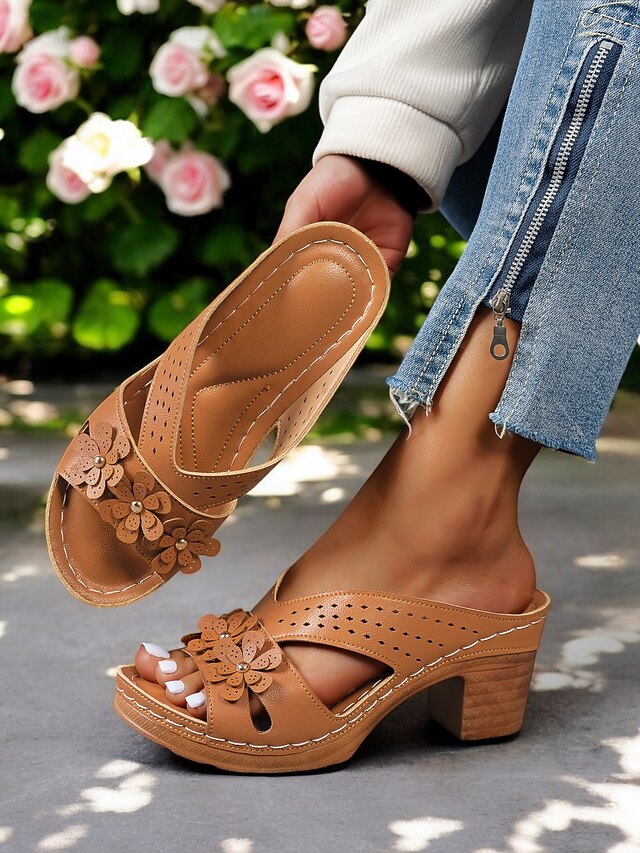 Open-Toe Chunky Heels with Floral Accent, Perforated Design and Comfortable Fit for Summer Parties and Casual Outings 8