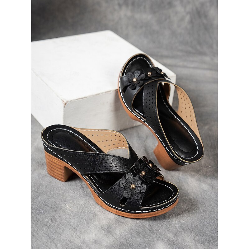 HOT ! Open-Toe Chunky Heels with Floral Accent, Perforated Design and Comfortable Fit for Summer Parties and Casual Outings