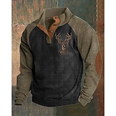 : The sweatshirt is characterized by its rustic color palette of black and brown with striking graphic and color block print elements. The standing collar adds a touch of modern style, while the rich brown button-up placket and elbow patches introduce a rugged charm. Detailed embroidery of a stag with intricate patterns on the chest adds an outdoor vibe, perfect for those who appreciate unique, rustic aesthetics.