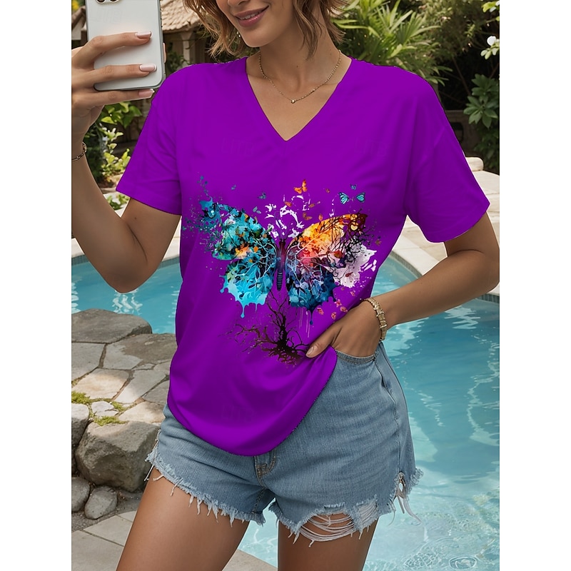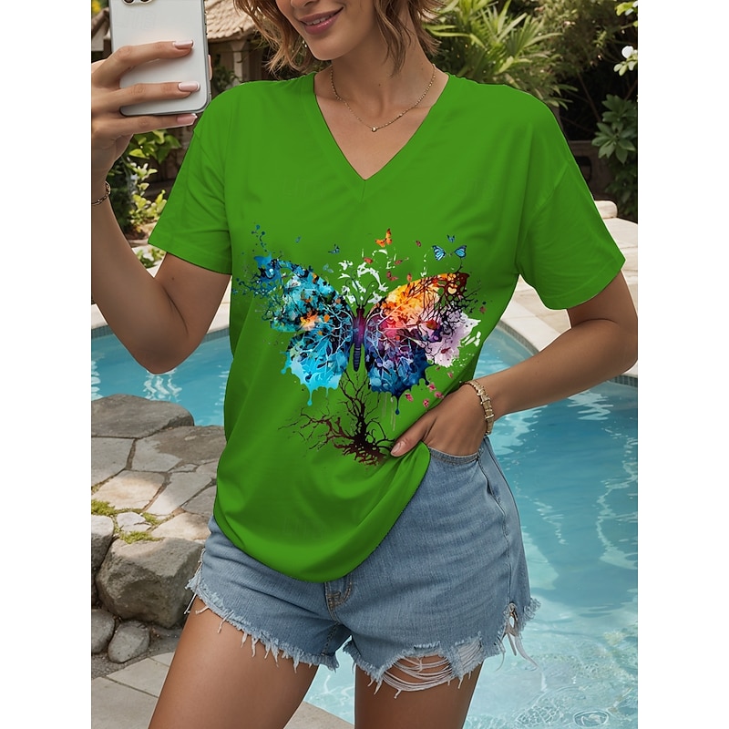 Women's T Shirt Graphic Animal Butterfly Vintage Stylish Classic Short Sleeve V Neck Regular Tops Daily Going out Weekend Print Black White Yellow Pink Red Summer Spring 12
