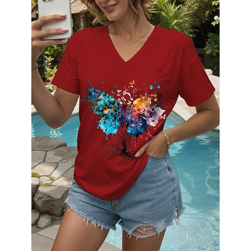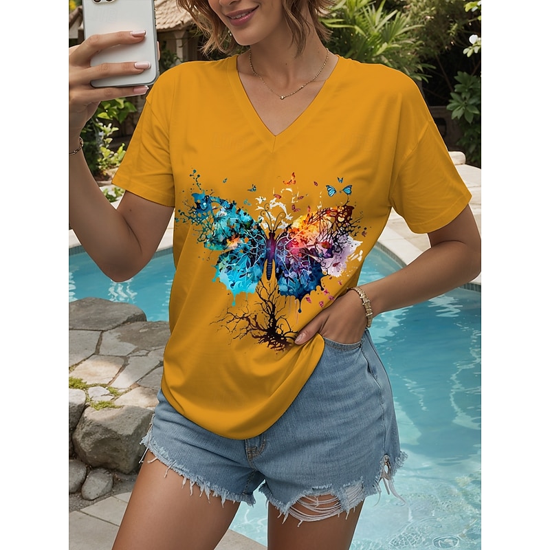 More information about Women's T Shirt Graphic Animal Butterfly Vintage Stylish Classic Short Sleeve V Neck Regular Tops Daily Going out Weekend Print Black White Yellow Pink Red Summer Spring