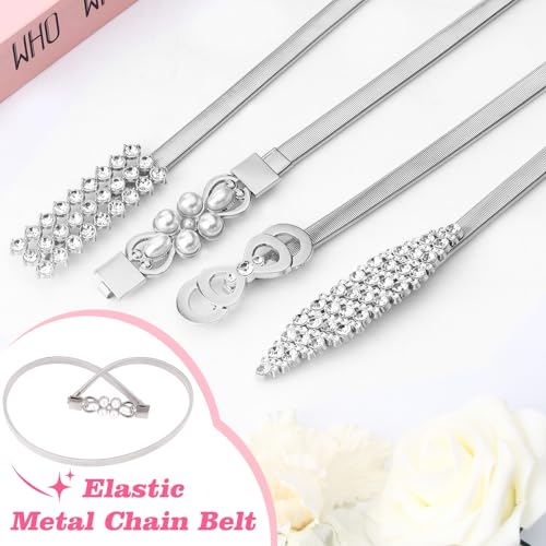 4 Pack Women Skinny Waist Belt for Dress, Elastic Metal Chain Belt Fashion Rhinestone Pearl Thin Stretchy Cinch 4