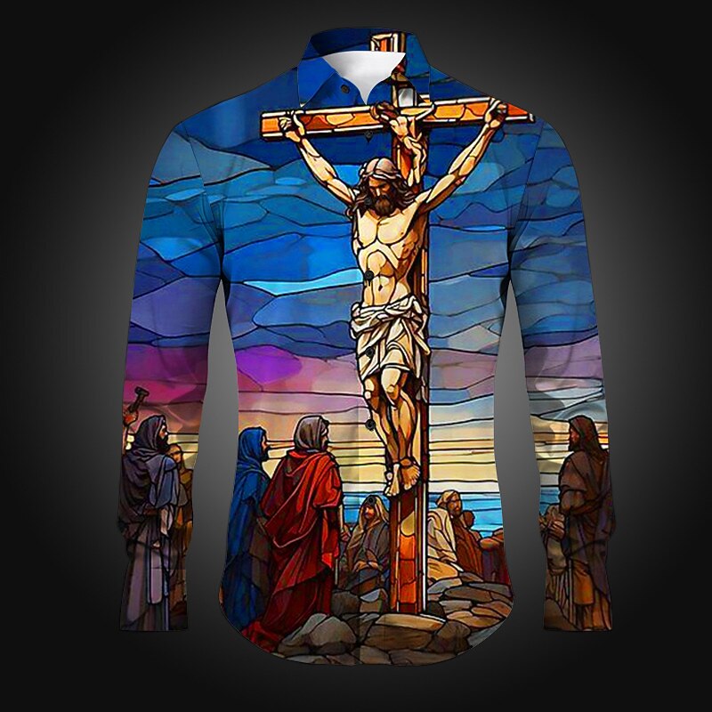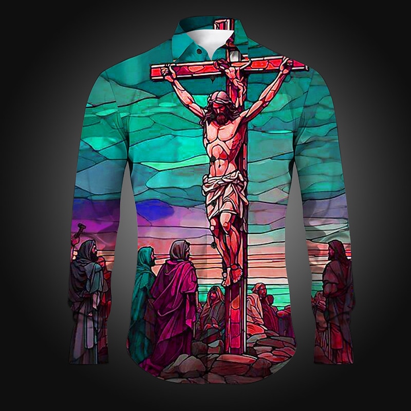 Men's Jesus Shirt Button Up Shirt Long Sleeve Vintage Artistic Daily Wear Going out Spring Turndown Print Button-Down Burgundy Navy Blue Blue Dark Green Green 10