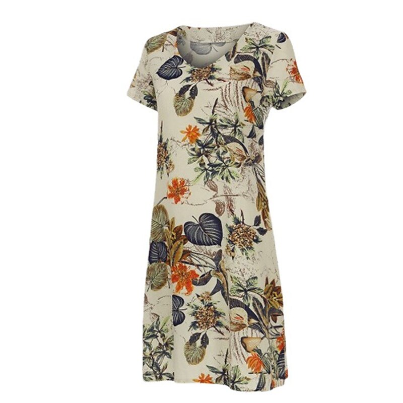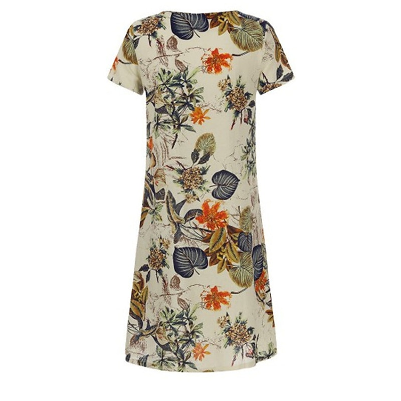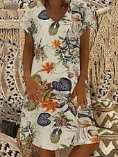 Highlights [Fabric]: Expertly crafted from a blend of soft cotton and breathable linen, this dress ensures comfort in warm weather. The micro-elasticity of the fabric offers flexibility, making it ideal for all-day wear during spring and summer. [Silhouette]: The dress features a relaxed A-line silhouette, which flatters a variety of body types while providing a comfortable, loose fit. Its midi length adds a touch of elegance, making it versatile for both casual and more refined occasions. [Design Highlights]: This elegant summer dress showcases a chic V-neckline and stylish short sleeves, enhancing its sophisticated yet casual appeal. The vibrant botanical print, featuring a colorful pattern of leaves and flowers, lends a tropical vibe that's perfect for sunny days. [Occasions]: Ideal for vacations, daily outings, and outdoor events, this dress is your go-to choice for any casual day event or beach outing. Its classic and basic style ensures it remains a staple in your wardrobe for seasonal adventures. [Size Range]: Available in sizes M, L, XL, and 2XL, this dress caters to a wide range of body shapes and preferences, ensuring a great fit for many.