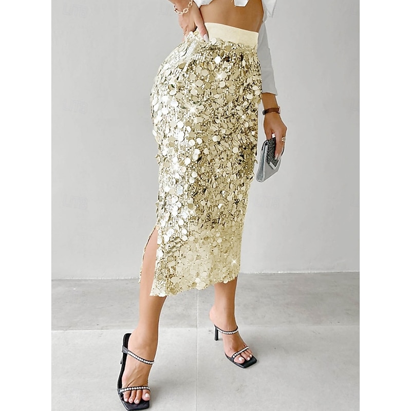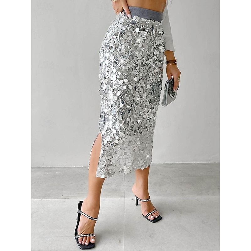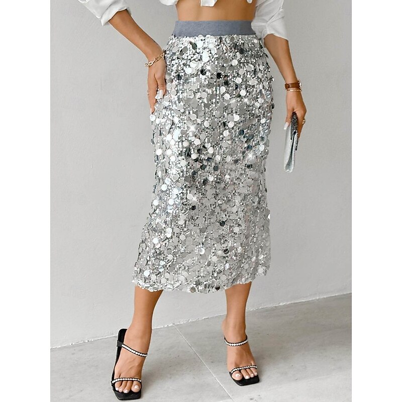 HOT ! Women's Skirt Bodycon Elegant Fashion Midi High Waist Skirts Plain Sequins Stretchy Party Street Silver Black Gold Spring Polyester