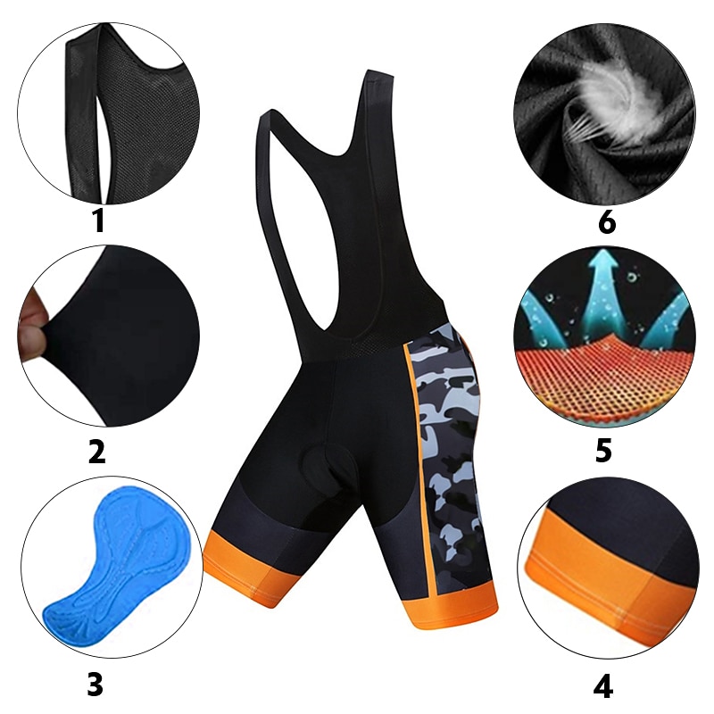 Highlights 1. Keep essentials handy with classic 3-pocket design 2. Breathable, moisture-wicking fabric for added comfort during long rides 3. Four-way stretchy crotch with high elasticity to prevent torn fabric 4. Anti-slip silicone grips prevent slippage and ensure a compressed fit 5. 3D thickened protection pad with gel and foam padding for added comfort and injury prevention 6. Durable spandex fabric with patchwork and camouflage patterns 7. Suitable for both mountain bike MTB and road bike cycling disciplines 8. Quick-dry and UV-resistant properties for enhanced performance.