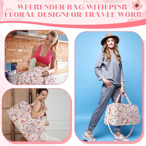 Large Quilted Travel Duffle Bag for Women Floral Portable Gym Lightweight Weekender Bag with Zipper Pockets Workout Grocery Pouch Duffle Pouch for Travel Work(Pink Floral) 4