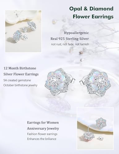 • Opal Earrings for Women: These white opal flower earrings features a central 7 mm round cut lab grown diamond surrounded by six oval cut created opal, resembling a blooming flower. Each petal is adorned with tiny lab grown diamonds for added sparkle