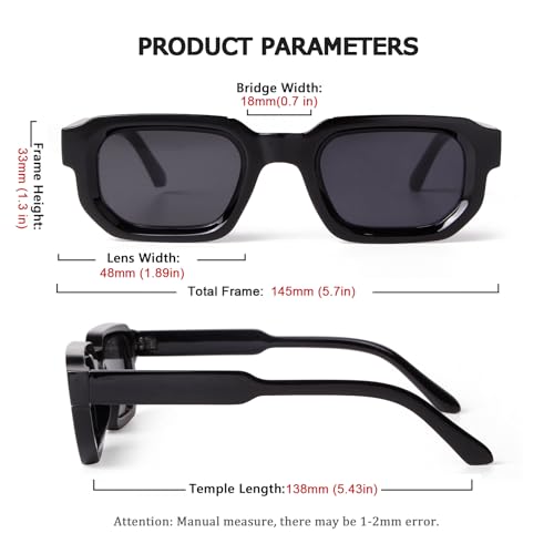 • 【Trendy Black Glasses Dimension】Sunglasses lens width: 48 mm (1.89 inches), lens height: 33 mm (1.3 inches), temple length: 138 mm (5.43 inches) and nose bridge: 18 mm(0.7 inches). The package dark black sunglasses*1, microfiber pouch*1 (Can be used for Cleaning Cloth )