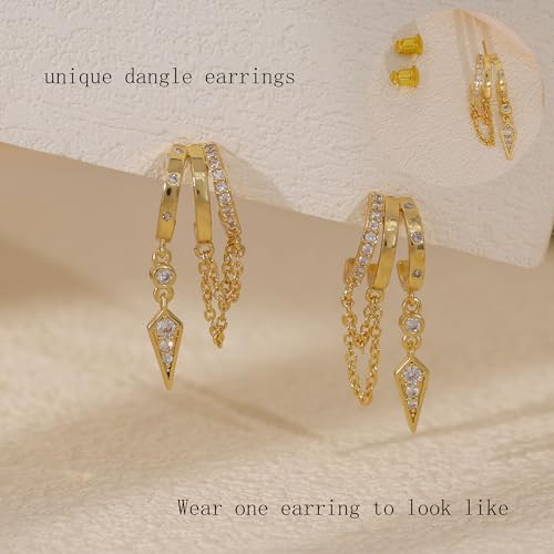 Gold Earrings For Women, Dangle Earrings 14K Gold Plated Huggie Chain Earring For Women Trendy Unique Small Hoop Earring Dainty Long Drop Tarnish Free Gold Jewelry 1