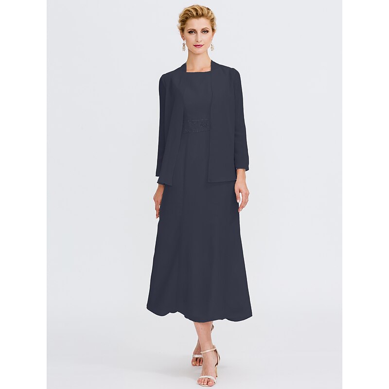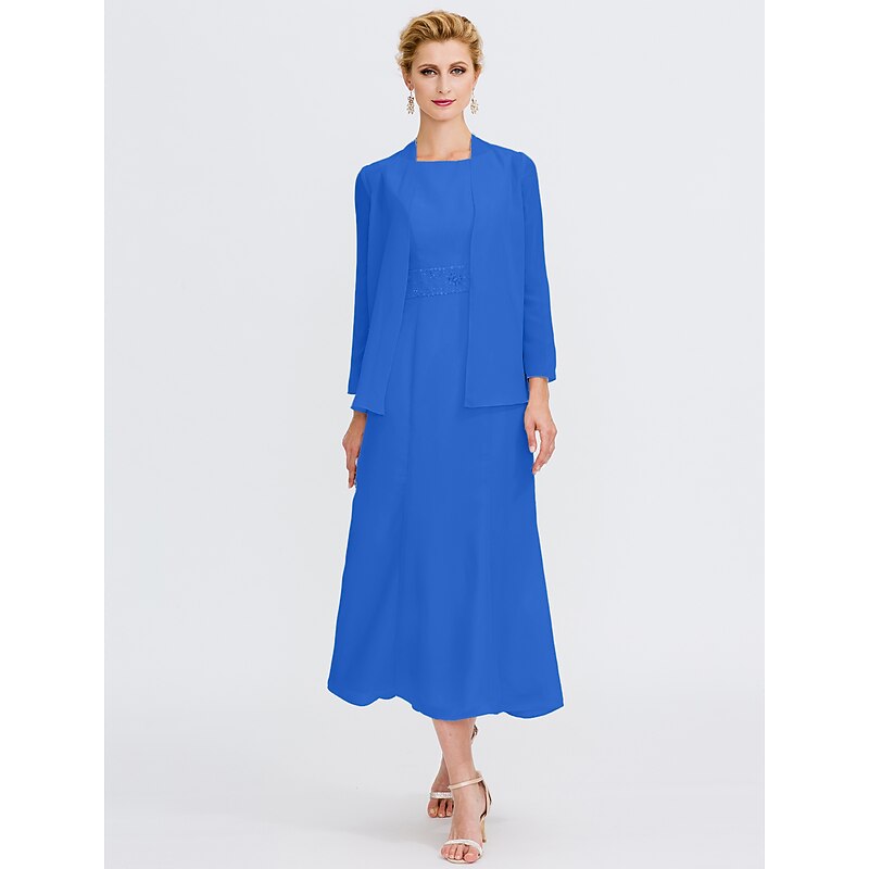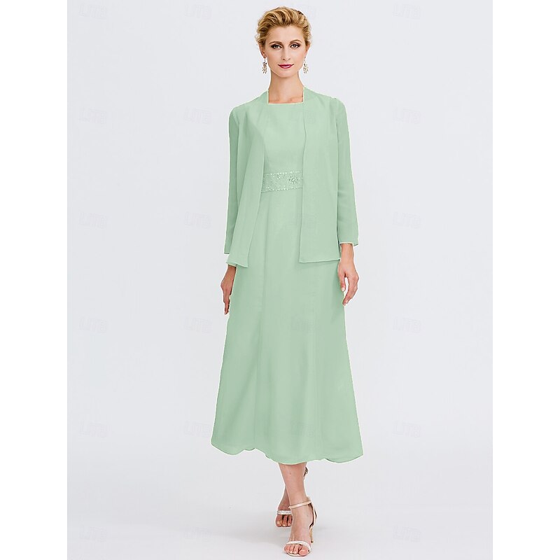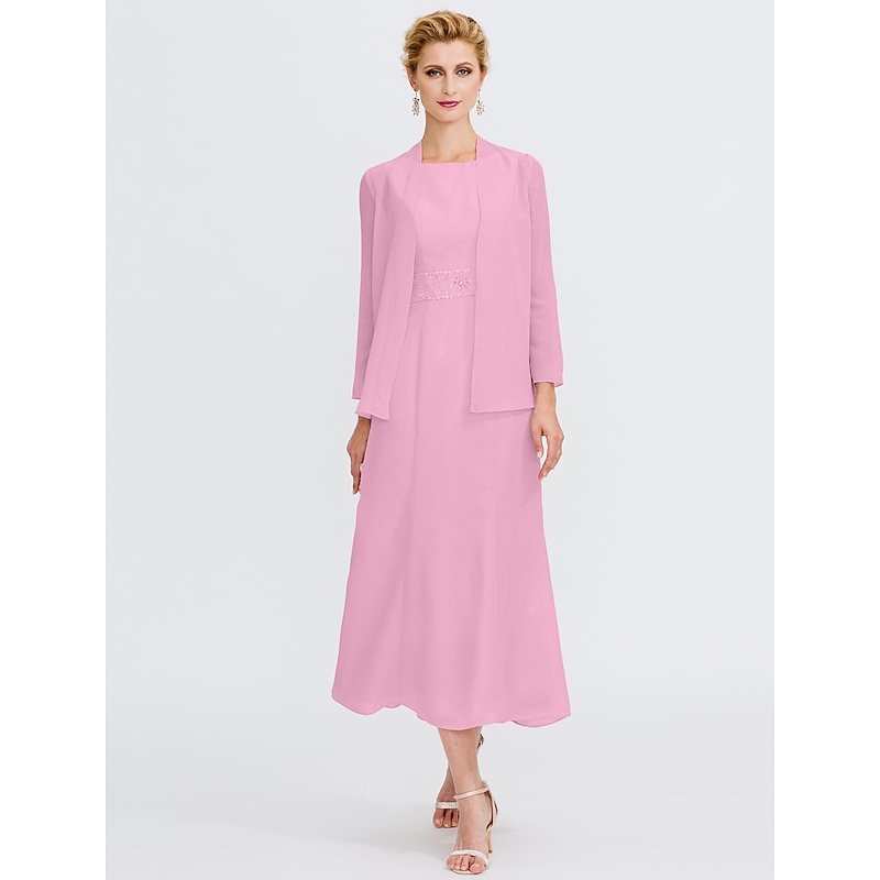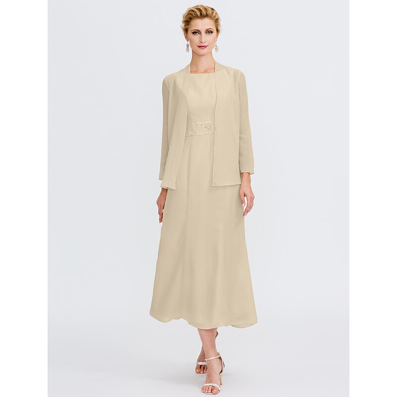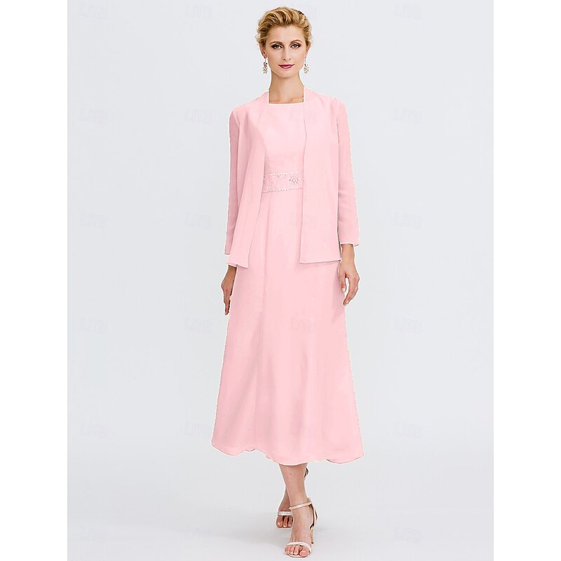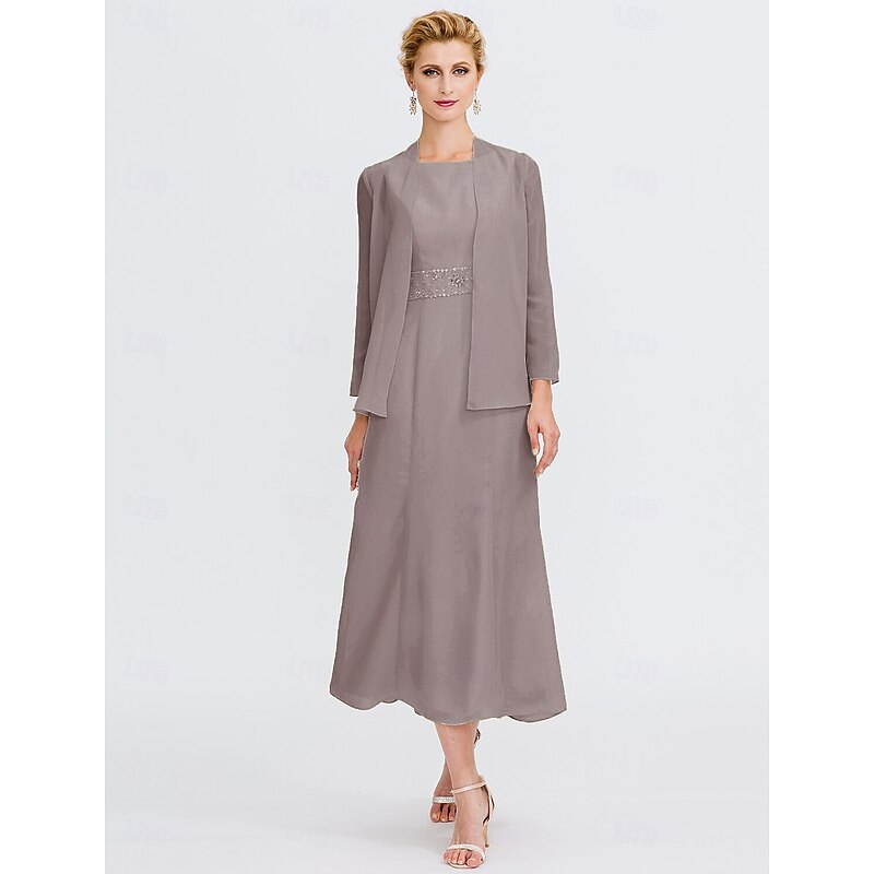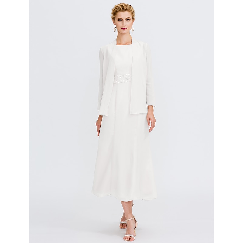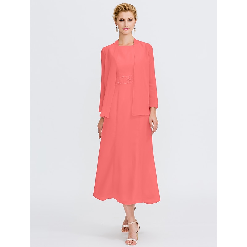 HOT ! Beach Wedding Two Piece Sheath Mother of the Bride Dress Wedding Guest Elegant Plus Size Jewel Neck Tea Length Chiffon Sleeveless Wrap Included with Sash / Ribbon Pleats Beading
