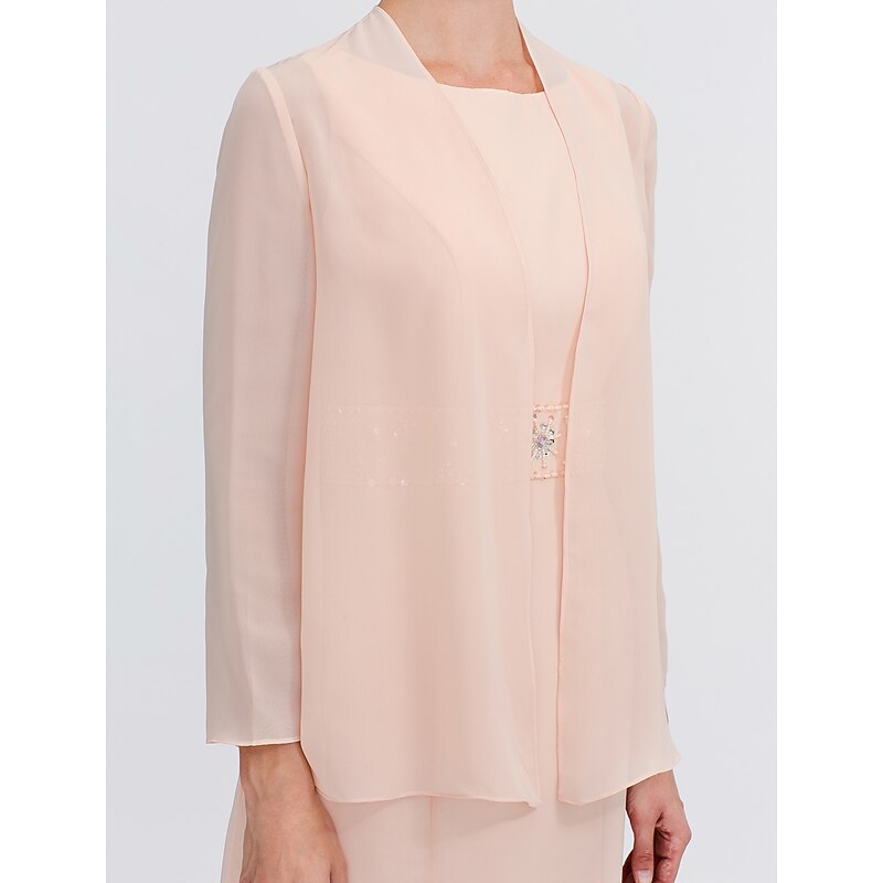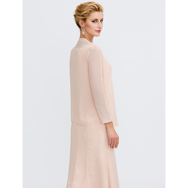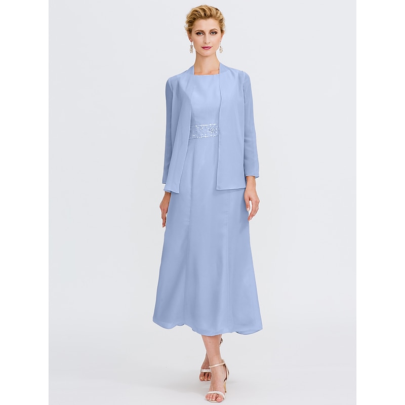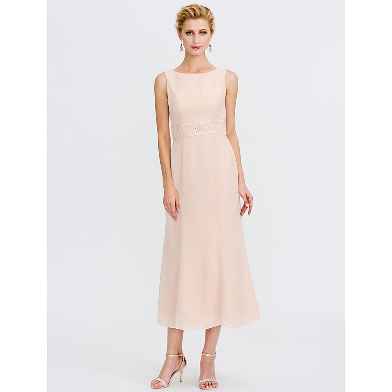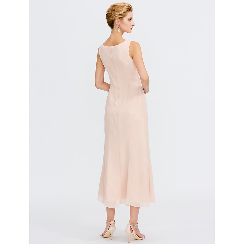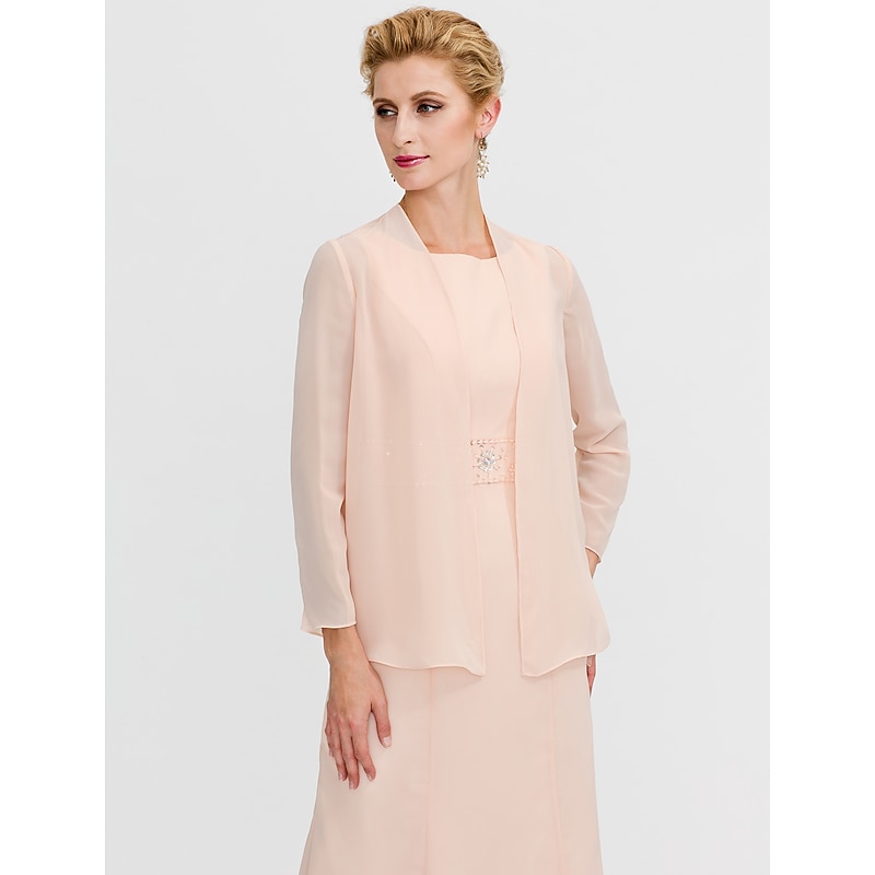 More information about Beach Wedding Two Piece Sheath Mother of the Bride Dress Wedding Guest Elegant Plus Size Jewel Neck Tea Length Chiffon Sleeveless Wrap Included with Sash / Ribbon Pleats Beading