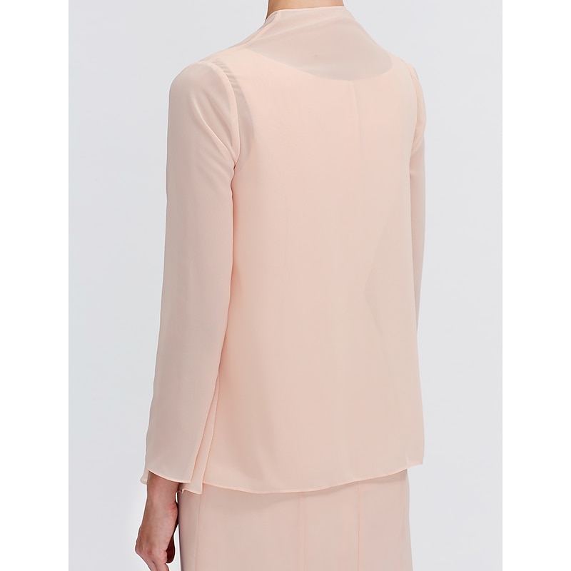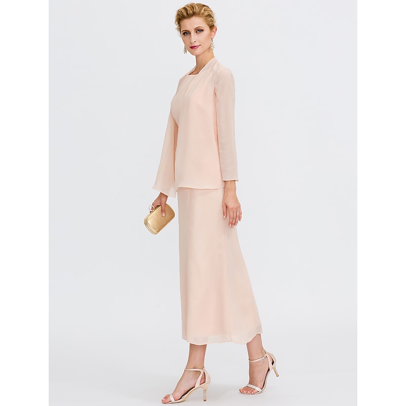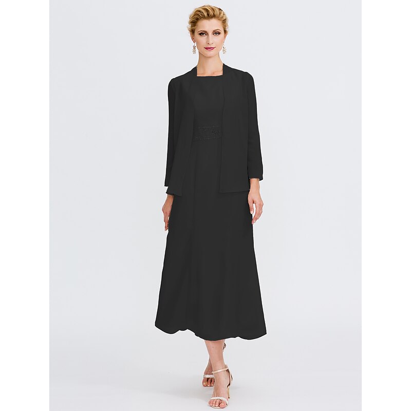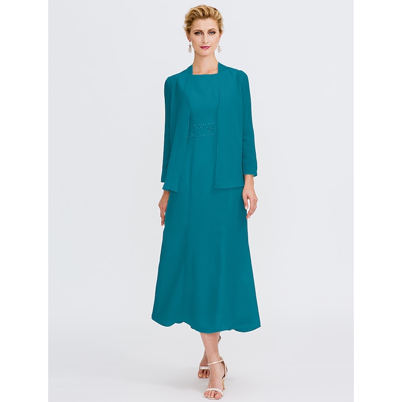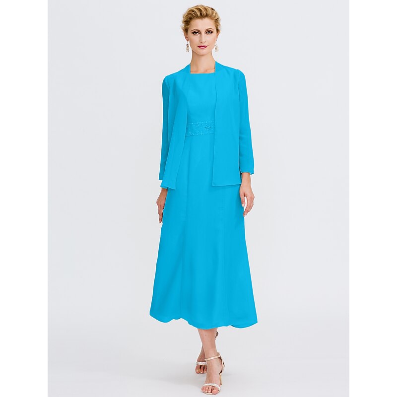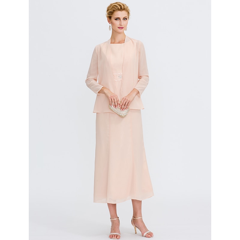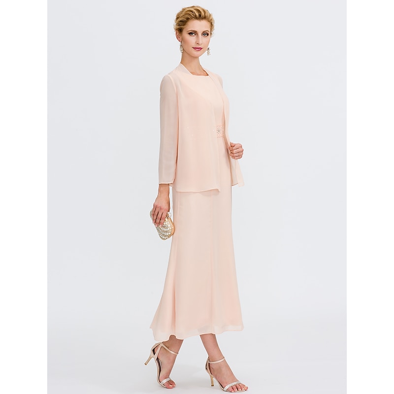 More information about Beach Wedding Two Piece Sheath Mother of the Bride Dress Wedding Guest Elegant Plus Size Jewel Neck Tea Length Chiffon Sleeveless Wrap Included with Sash / Ribbon Pleats Beading