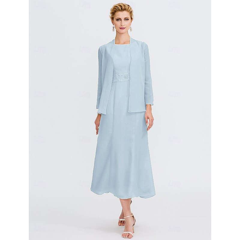 Beach Wedding Two Piece Sheath Mother of the Bride Dress Wedding Guest Elegant Plus Size Jewel Neck Tea Length Chiffon Sleeveless Wrap Included with Sash / Ribbon Pleats Beading 35