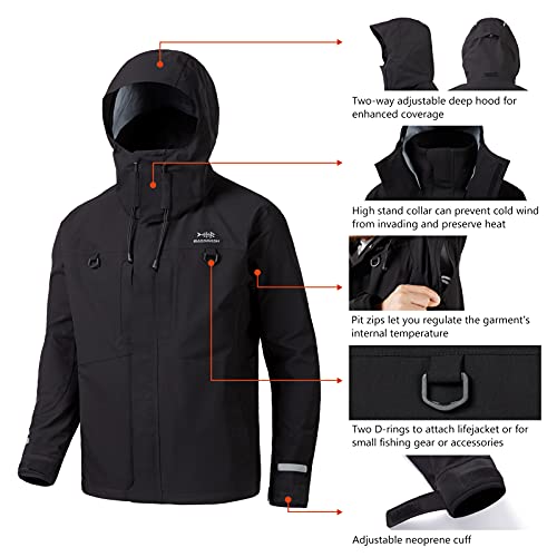 • Features high stand collar and adjustable drawstring hem that can prevent cold wind from invading; Two-way adjustable deep hood for enhanced coverage, and the hood can be rolled up into the collar when not in use; Adjustable neoprene cuffs are soft and the stretch characteristics of the neoprene provide for a snug fit and ensure the water won't enter through the cuffs.