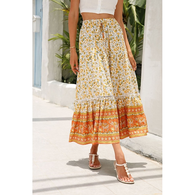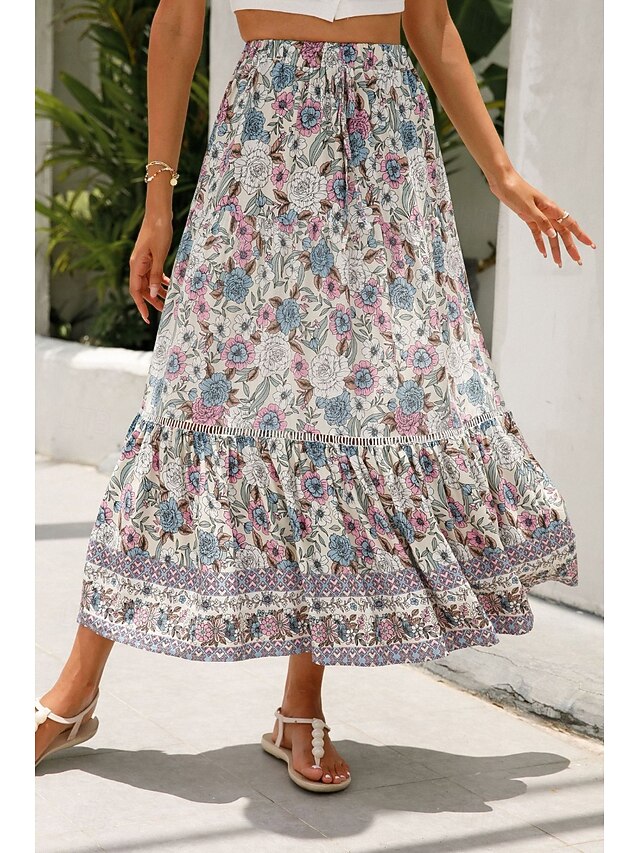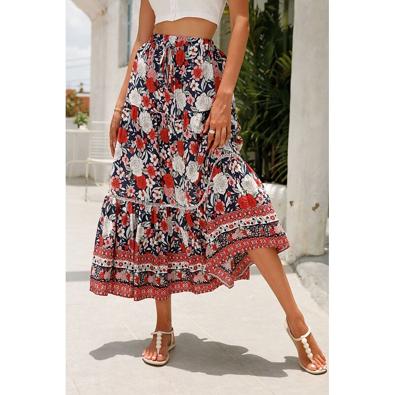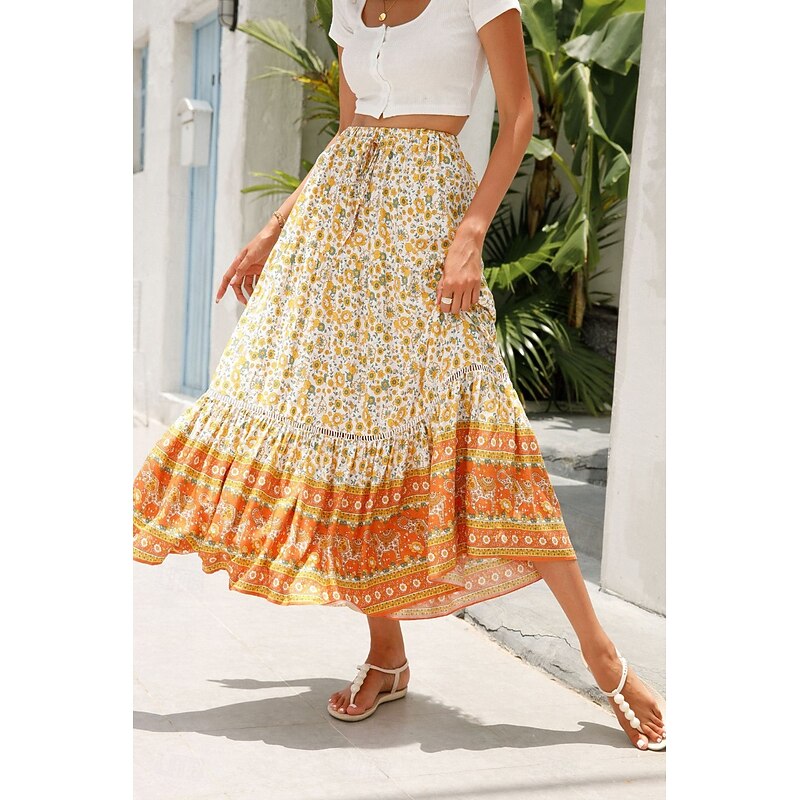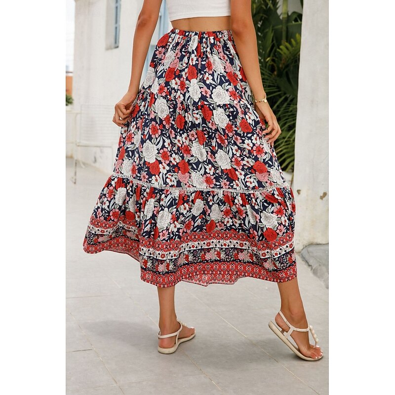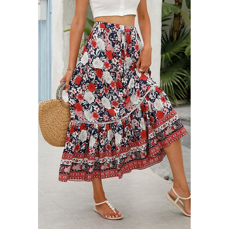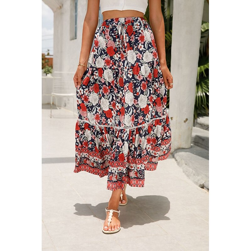More information about Women's Skirt Bohemia Casual Boho Maxi Mid Rise Skirts Floral Print Micro-elastic Vacation Street Almond Red Blue Orange Summer Rayon