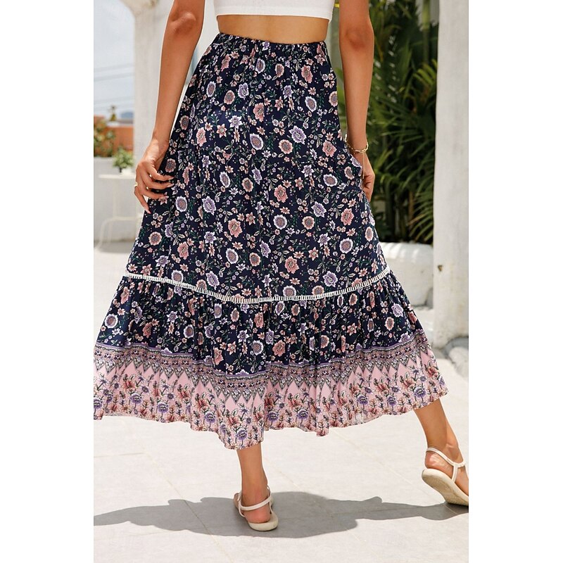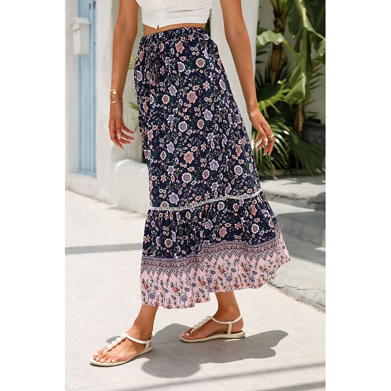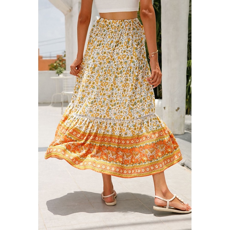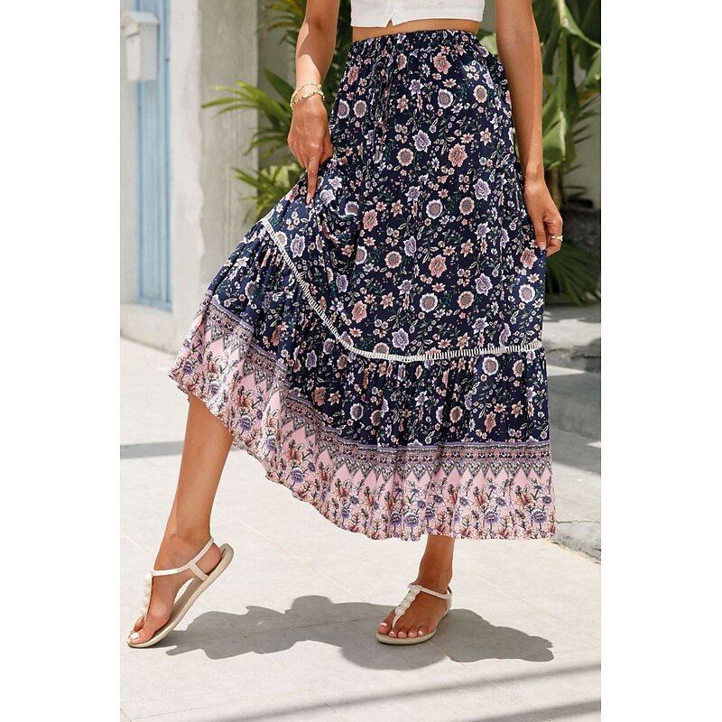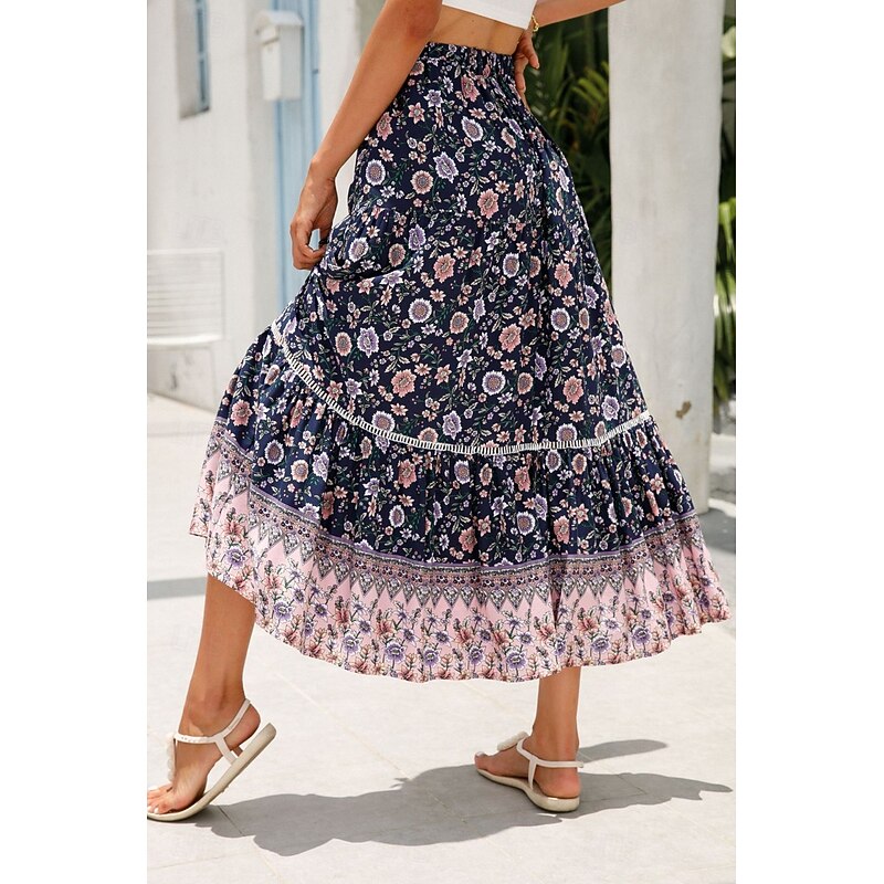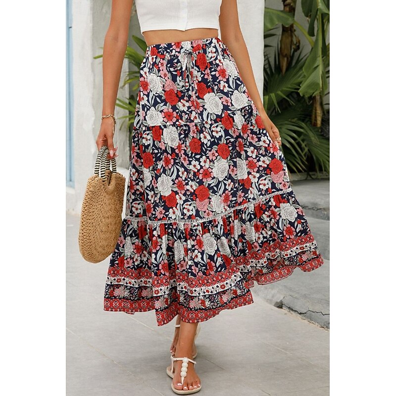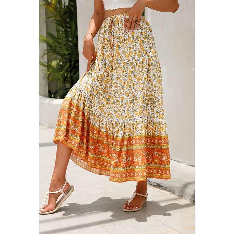 More information about Women's Skirt Bohemia Casual Boho Maxi Mid Rise Skirts Floral Print Micro-elastic Vacation Street Almond Red Blue Orange Summer Rayon