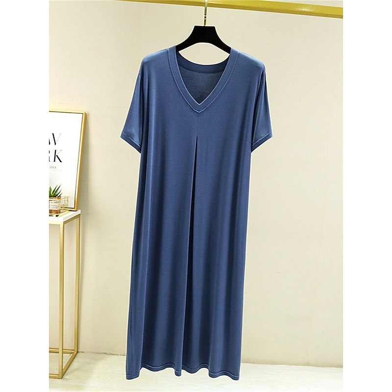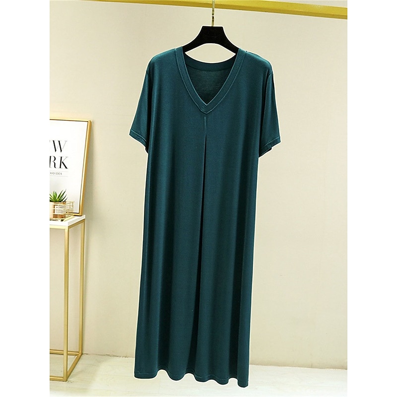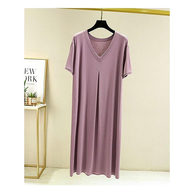 Highlights [Fabric] Crafted from lightweight and breathable modal fabric, this women's nightgown dress ensures ultimate comfort with its gentle stretch and micro-elasticity. The fabric's softness naturally fits to your body's contours, providing a luxurious feel during wear. [Fit] Featuring a relaxed, draped silhouette, this nightshirt offers a flattering fit with a V-wire neckline. The short sleeves add to its minimalist appeal, making it perfect for both warm summer and cool fall nights. The flowing design allows for ease of movement, enhancing comfort. [Design Highlights] This simple, pure color dress is a testament to understated elegance. Its clean lines and absence of embellishments create a versatile look that can be styled easily. The V-wire neckline adds a modern touch, making it a subtle yet standout piece in your wardrobe. [Occasions] Ideal for daily wear at home, this nightgown transitions seamlessly from soft sleepwear to casual loungewear. Whether you're relaxing in bed or enjoying a laid-back evening at home, this dress caters to your lifestyle with effortless chic. [Size Notice] Available in sizes L and XL, this dress ensures a comfortable fit for adult women, accommodating diverse body shapes with its micro-elastic fabric and thoughtfully designed cut.