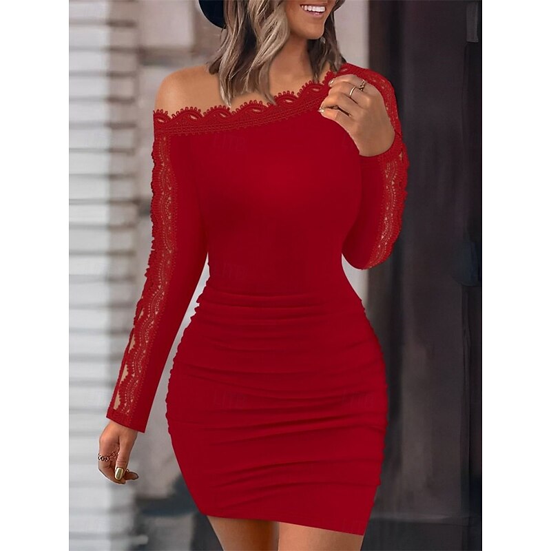 Highlights [Fabric] : Crafted from high-quality polyester, this mini dress offers a comfortable micro-elastic fit, ensuring ease of movement while maintaining its shape. The fabric's smooth drape adds a touch of luxury to the overall design. [Fit Type] : This bodycon dress features a regular fit that elegantly hugs the body, highlighting natural curves while maintaining a chic and sophisticated silhouette. The subtle ruching on the skirt enhances the waistline for a flattering look. [Design Highlights] : The dress boasts an alluring off-shoulder neckline, complemented by intricate lace patchwork along the neckline and sleeves, adding a feminine touch. The long sleeves feature delicate lace patterns, creating an appealing transparent effect that combines elegance with a hint of allure. [Occasions] : Ideal for fall and winter events, this versatile dress is perfect for sophisticated evenings out, upscale gatherings, or even stylish street appearances. Its timeless charm and elegant design ensure you stand out in any setting. [Size Range] : Available in a variety of sizes from S to 2XL, catering to a wide range of body types. This mini dress is designed to provide a flattering fit for different figures, making it an excellent choice for many occasions.