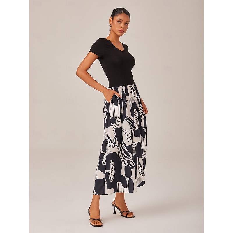 Women's Black and White Maxi Dress Knitted Patchwork Woven Geometric Abstract Print Elegant A Line Flowy Skirt Elastic Waist Casual Daily Wear 6