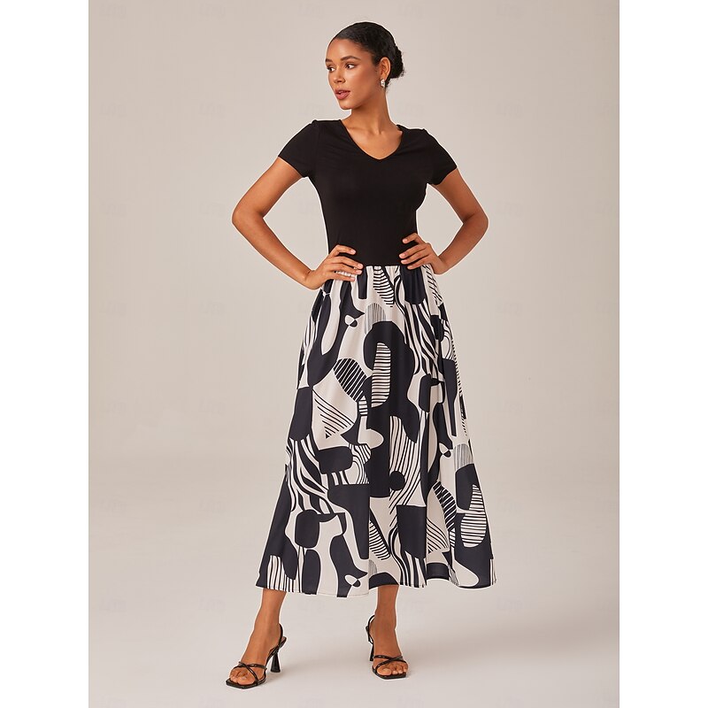 HOT ! Women's Black and White Maxi Dress Knitted Patchwork Woven Geometric Abstract Print Elegant A Line Flowy Skirt Elastic Waist Casual Daily Wear