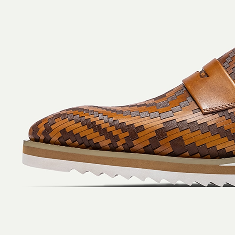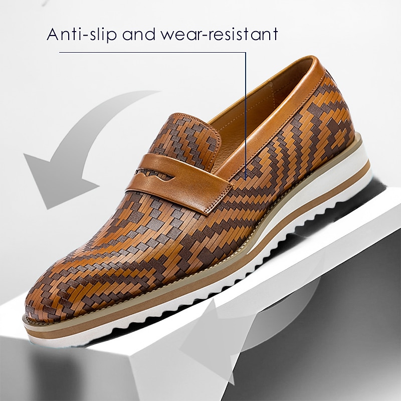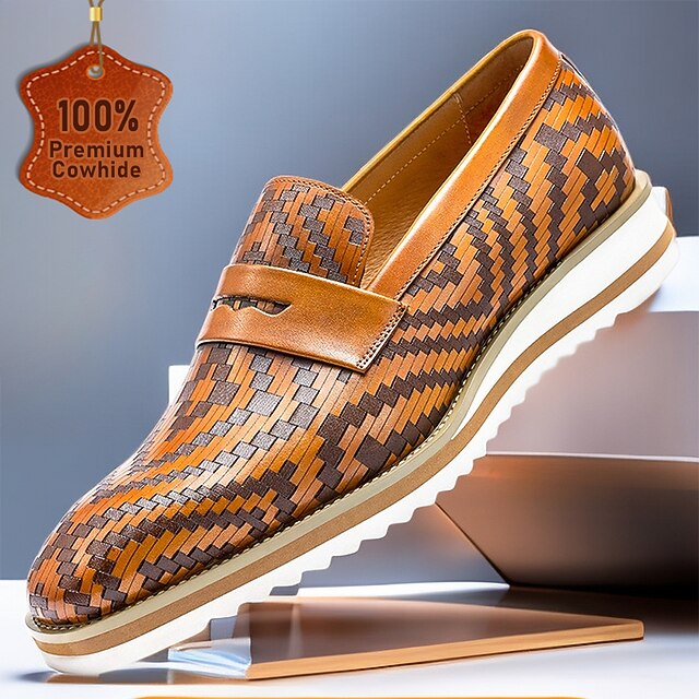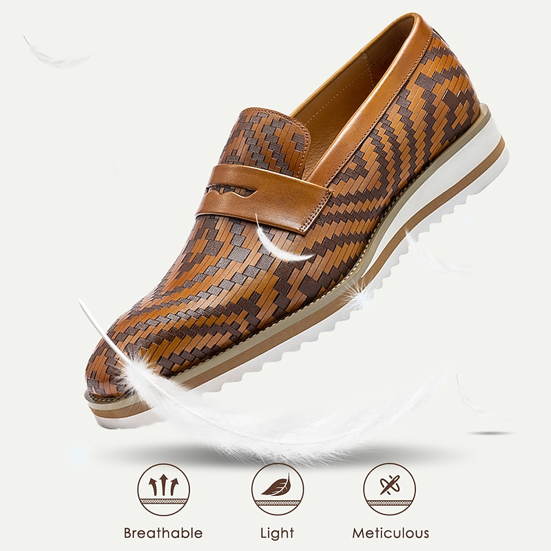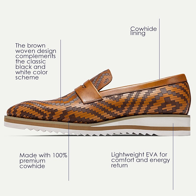 Highlights [Material and Construction] : Expertly crafted from 100% premium Italian full-grain cowhide, these men's loafers offer both durability and exceptional comfort. The leather upper and cowhide lining ensure a breathable and luxurious experience. [Fit and Style] : These loafers feature a classic slip-on style with a round toe shape, providing convenience and ease of wear. The sophisticated woven pattern in brown and tan shades adds a retro, yet modern touch to the overall vintage design. [Design Highlights] : Emphasizing a handwoven finish, the Roman-style mules boast a unique penny loafer aesthetic. The EVA outsole provides a comfortable, slip-resistant base, ensuring stability and support for all-day wear. [Occasions] : Ideal for both formal events and casual outings, these loafers blend elegance with practicality. They are versatile enough to be worn at weddings, business meetings, or leisurely weekend gatherings, effortlessly complementing a variety of looks. [Size Range] : Offered in a comprehensive range of sizes from US7 to US13 (EU40 to EU46 / UK6 to UK12), these loafers are designed to cater to a wide audience, ensuring a perfect fit for every gentleman.