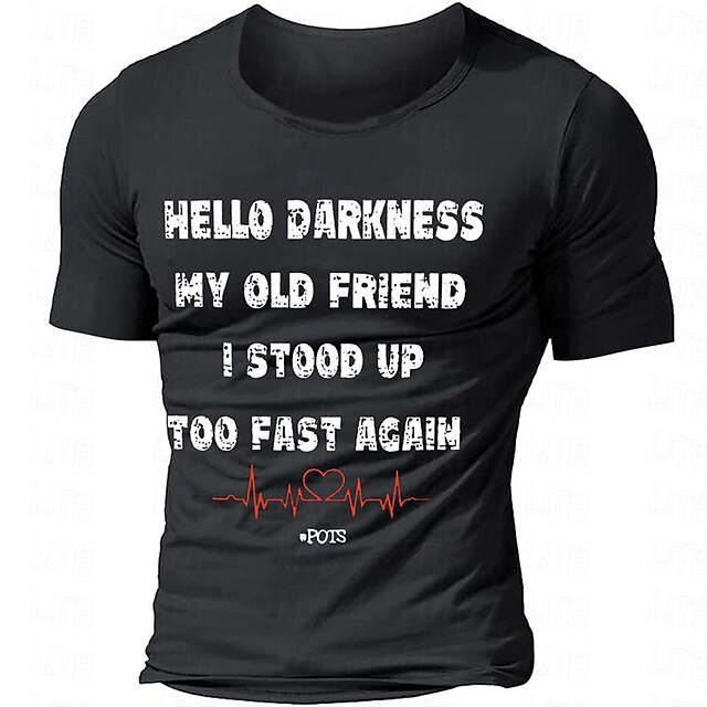 Highlights Fabric Crafted from 100% cotton, this men's T-shirt offers a soft, breathable, and comfortable experience. The premium cotton material ensures durability while providing a natural feel, making it ideal for warm summer days. Fit and Style Designed in a regular fit, this classic crew neck T-shirt ensures both comfort and style. The short sleeve construction complements the relaxed silhouette, making it a versatile piece suitable for casual and sports-inspired looks. Design Highlights This T-shirt features a striking graphic design with bold white letters on the front, delivering a humorous message, "HELLO DARKNESS MY OLD FRIEND I STOOD UP TOO FAST AGAIN," accompanied by a red heartbeat line and "#POTS" below. This playful print is perfect for those who appreciate a touch of humor in their wardrobe. Usage Occasions Perfect for sports, outdoor activities, holiday getaways, or casual outings, this T-shirt fits seamlessly into various relaxed settings. Pair it with your favorite jeans or shorts for a laid-back yet stylish ensemble. Size Range Available in a wide range of sizes from S to XXL, this T-shirt accommodates various body types. Whether you’re looking for a snug fit or a more relaxed look, there is a suitable size for everyone within this collection.