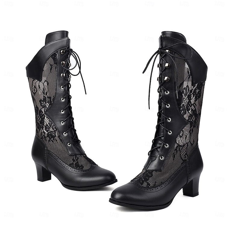 : Crafted from high-quality PU leather combined with delicate lace panels, these boots offer a chic balance of durability and elegance. The smooth leather complements the intricate lace accents, giving the boots a vintage yet contemporary feel.